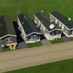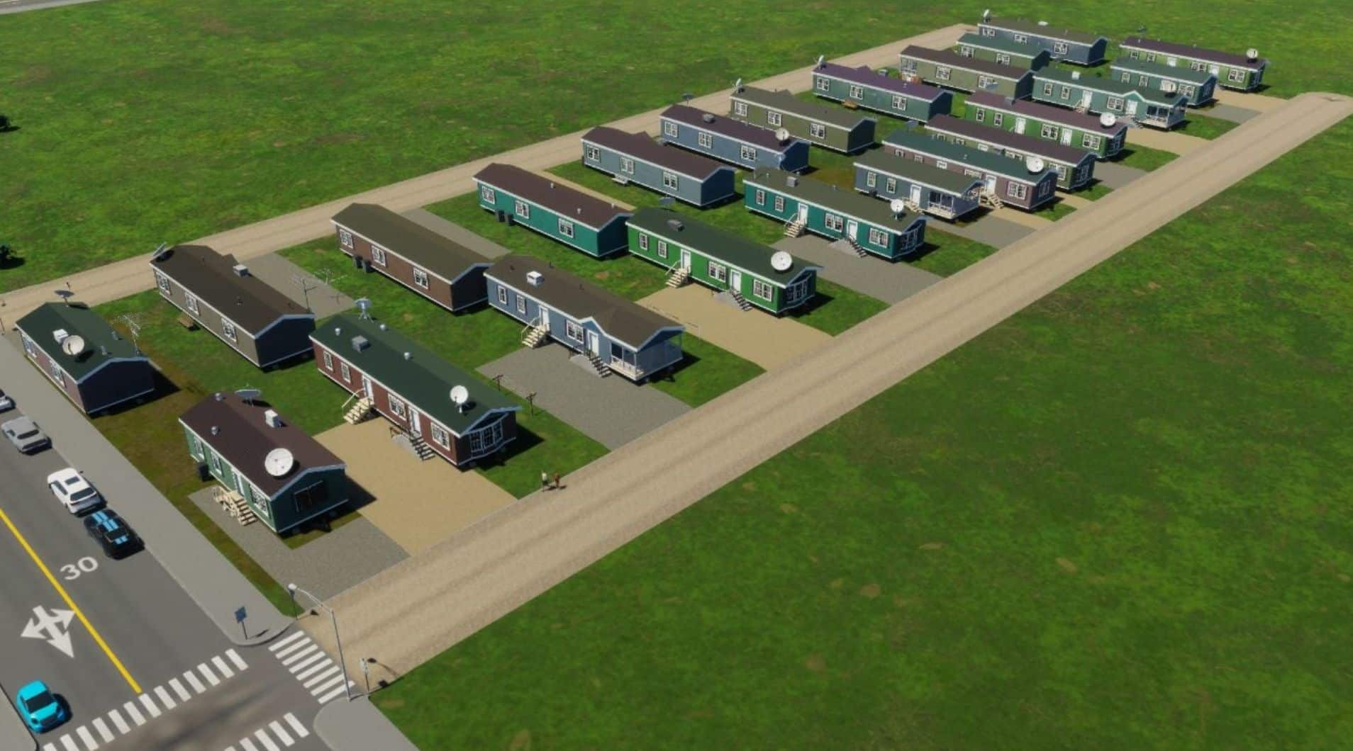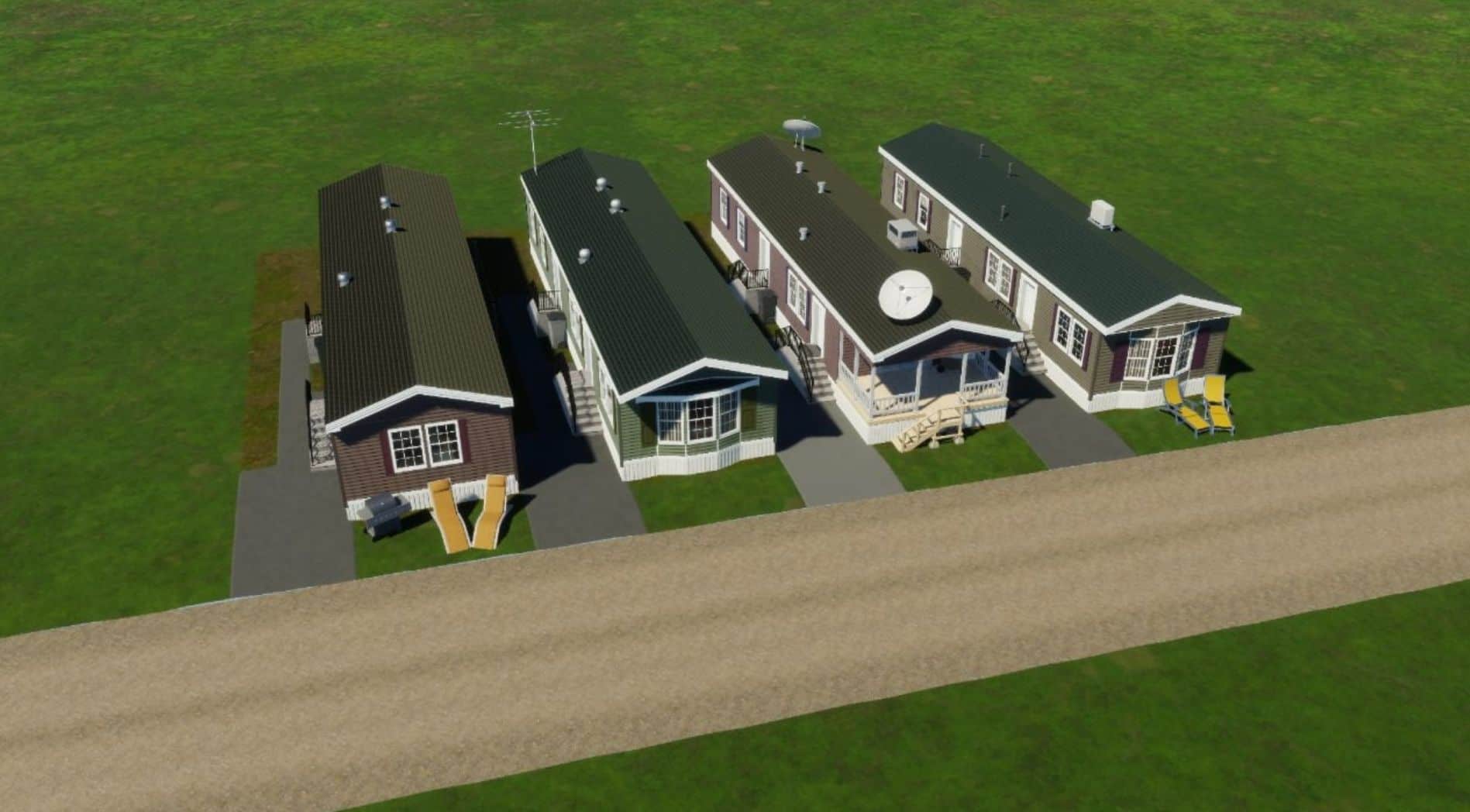 A variety of mobile homes of different designs. They use a unique zone called “NA Mobile Homes,” which you can find under the Residential tab in North American theme.