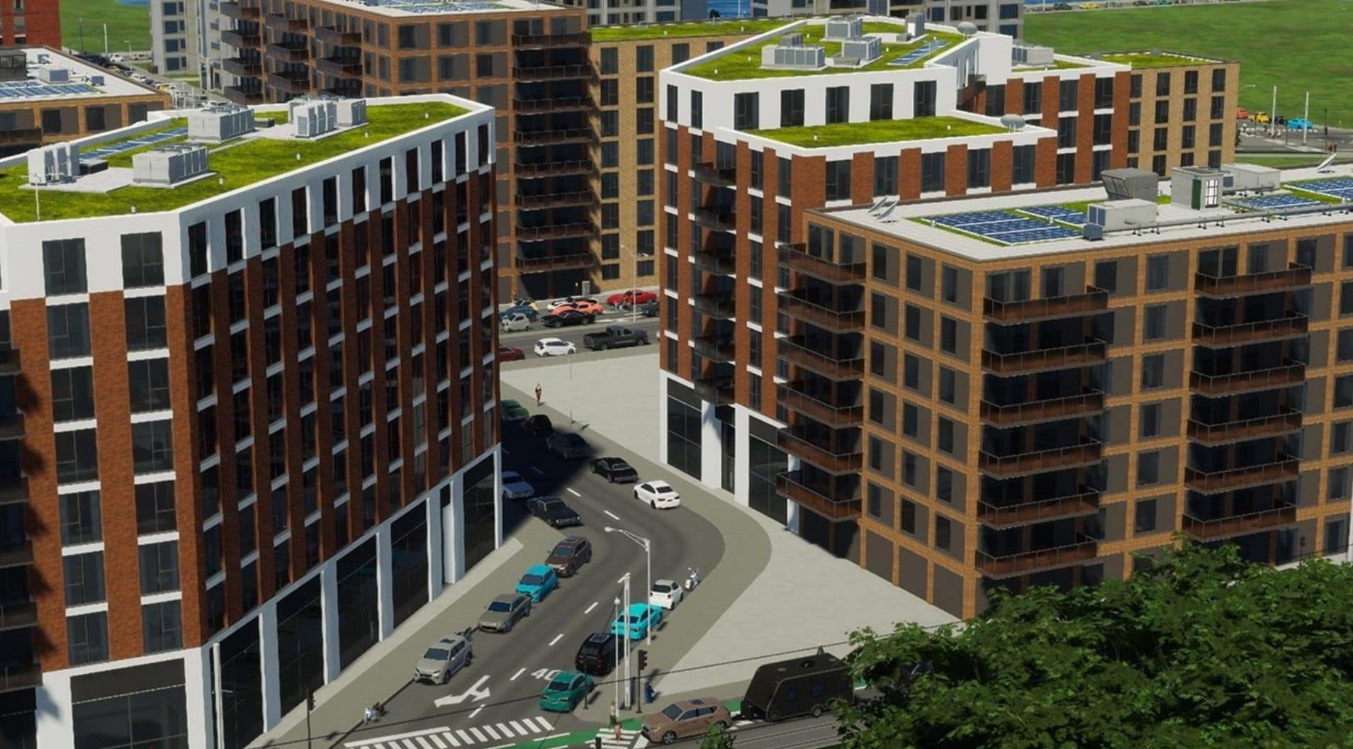 This (mini) Pack includes 8 different buildings from the Royal Wharf development in London, England. The medium density apartment buildings all have a sleek, modern brick facade and a green roof (vegetation).
